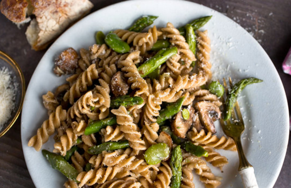 Asparagus, mushrooms, parmesan and whole-wheat noodles. This recipe is for the veggie lover for sure. I like to make a garlic and light butter sauce to put on top.