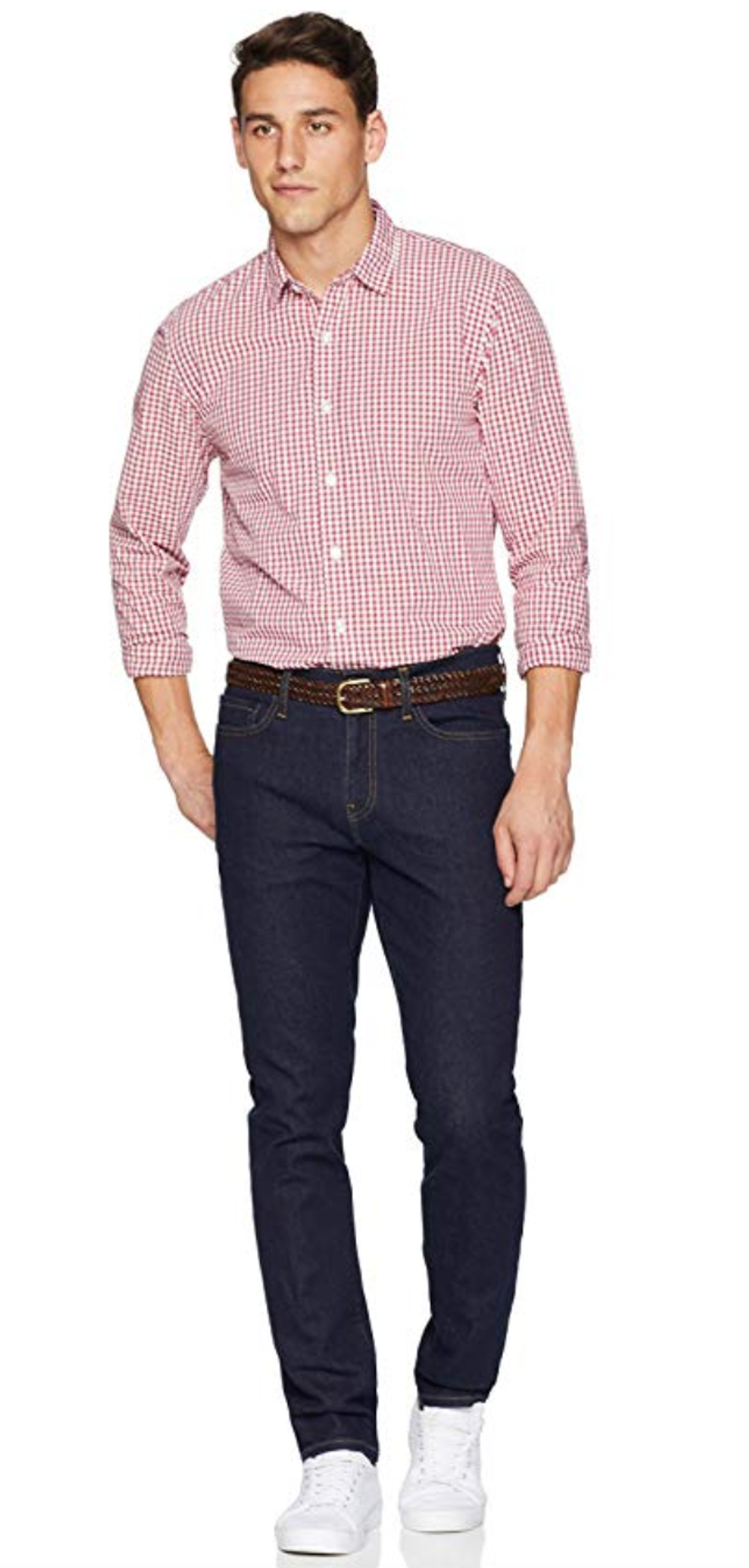 The key word here is slim, not skinny. Slim means that they're not too tight around the calves but should slightly graze them. These jeans can be easily dressed up with a blazer or down with a casual tee. Throw on some loafers or lace-ups and you're good to go! Try on as many as you can until it feels right.