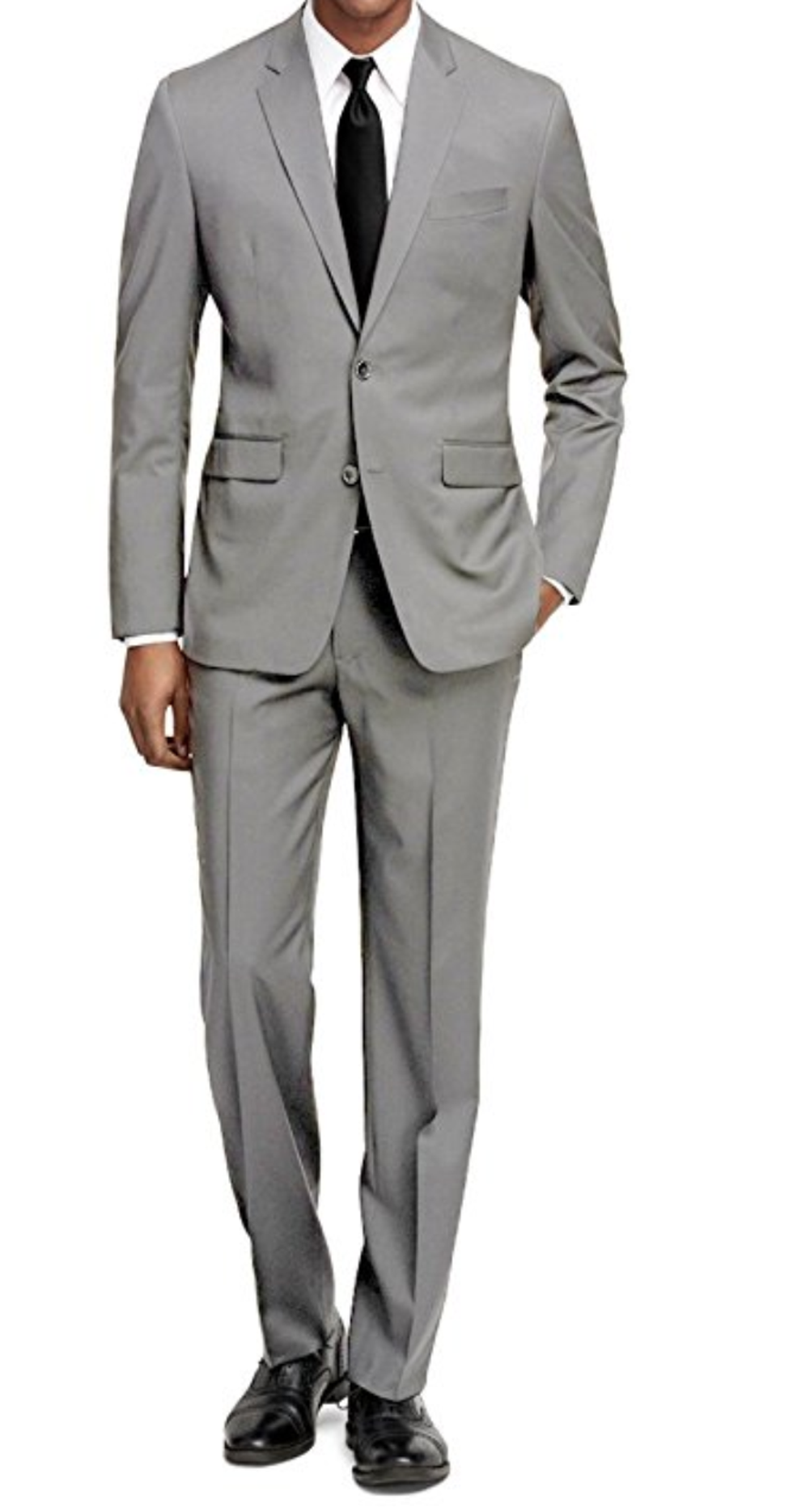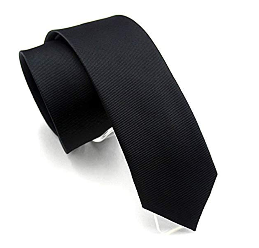 I'd say go for a navy, black, or grey tie. Simple enough. Again, the key word is slim, not skinny tie. Look for one that is no more than 3 inches at its widest point. It can also be different textures like a silk knit since it's neutral and solid. Keep it simple and classy.