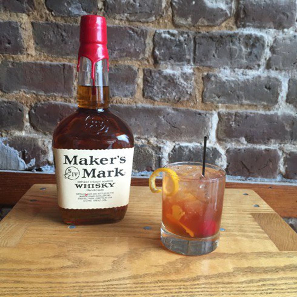 Maple Old Fashioned: Maker’s Mark, maple syrup, club soda, orange, and a cherry; served in a lowball glass glass and garnished with a lemon peel