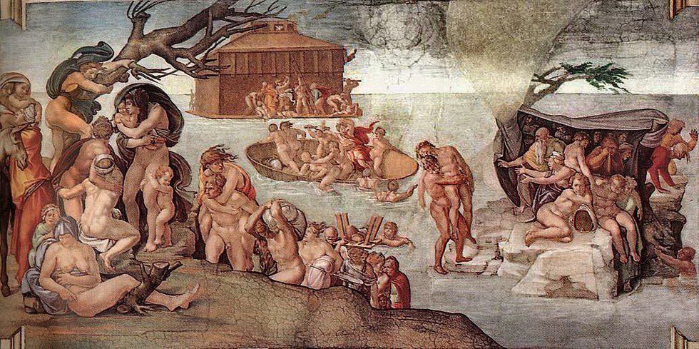 Almost all of the paintings on the vault of the Sistine Chapel had biblical themes, among them was the Great Flood of Noah, an apocalyptical event that resulted from the wrath of God. In this painting, chaotic throngs of human were seeking shelter from the flood and running for their lives while Noah’s ark was steering away in the far distance. Michelangelo was indeed very fascinated with violent and chaotic themes, since his artworks usually demonstrated twisted figures and human sufferings. This was definitely under the influence of Girolamo Savonarola, an Italian Dominican friar, whose sermons repetitively warned people of human sins and the punishment of a wrathful God. Michelangelo was obsessed with these teachings and always afraid of an eternal damnation from God, but his talents could even make beauty out of this fear and create masterpieces from human's pain and suffering.