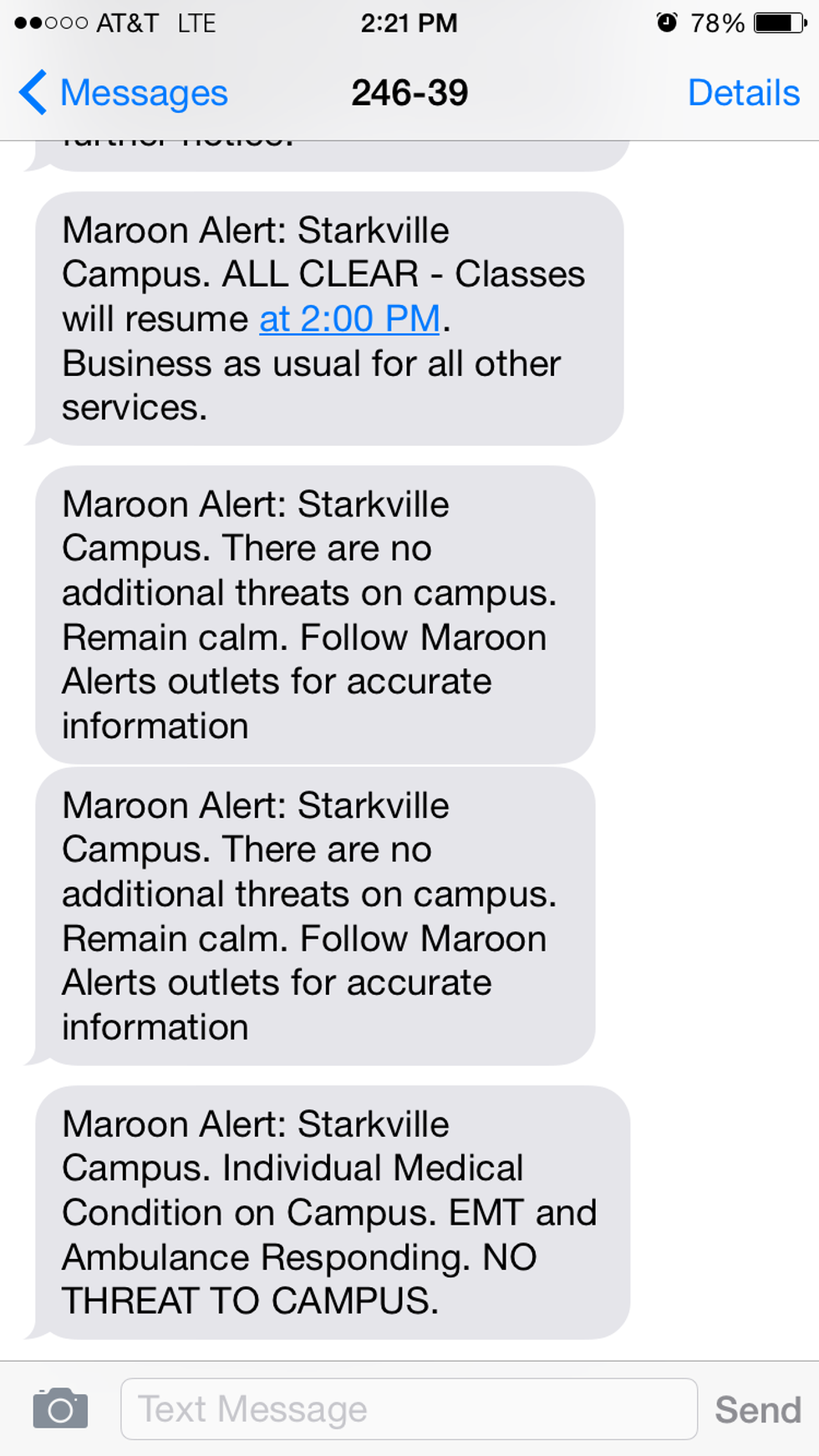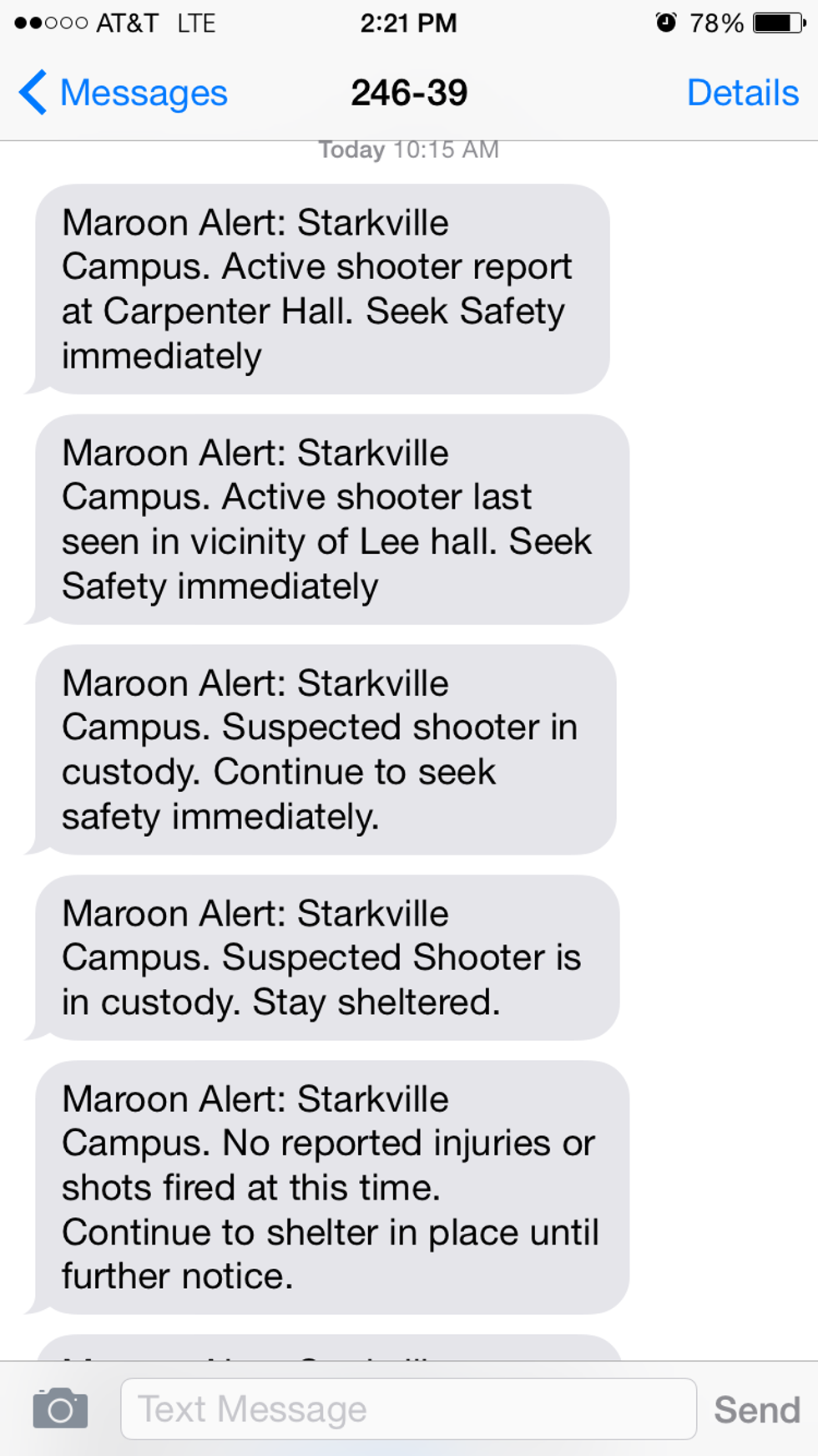 I spoke to Mississippi State University student Natalia Cardin about the situation on her campus. Upon receiving the "Maroon Alert" (the alert system used within MSU via text and email), she said, "Inside the buildings the teachers locked down the doors and turned off the lights. Students were told to stay under the desk. Many of my friends said they jumped out of the windows that were on the first floor of the building." Cardin also stated that the University would be holding support groups for students either tonight or tomorrow to attend.