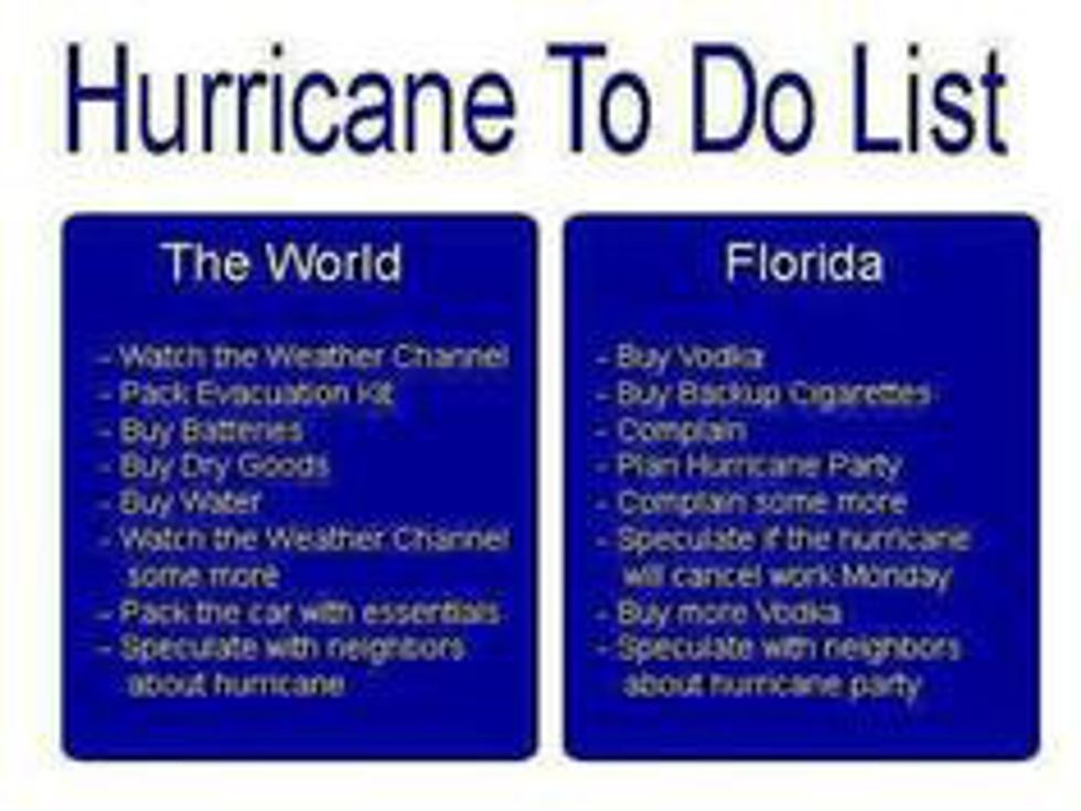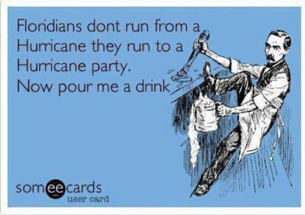 Floridians are also known for their "hurricane parties", which are held either before or during a storm where lots of alcohol is consumed by all. It creates a sense of camaraderie for neighbors, friends, even strangers who bond simply because a hurricane is coming. So in honor of Tropical Storm Erika, or Hurricane Erika as it may become, let's play a drinking game!