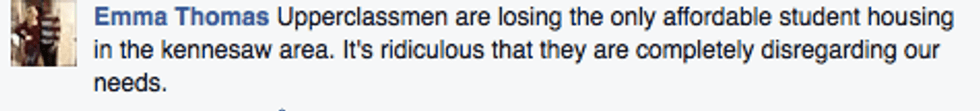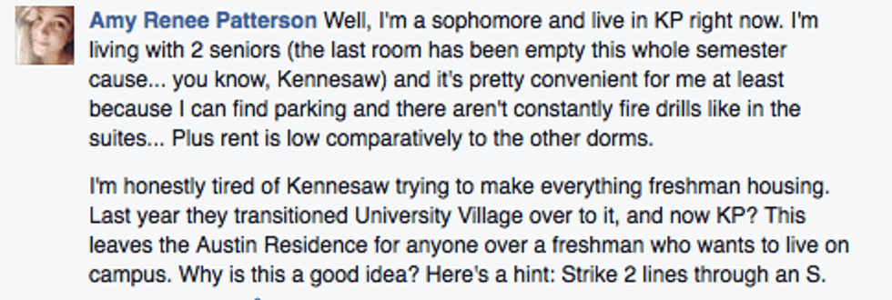 In all honesty, we residents of KSU Place are furious about this abrupt and outrageous change. One student, Annalee Eagerton, spoke her mind about the issue and stated, "Overall, I cannot fully describe my disappointment in KSU Housing for its decision. I had hoped that the importance of the previously returning upperclassmen would outweigh the desire to make a profit off of an incoming class that does not yet exist, and [I] am saddened that that is not the case." She then continued on to say, "To imply that they do not deserve the housing they have given their loyalty and money to is disrespectful, especially as their years-long residence here has proven that not only are they committed to your housing but to the university in general, and are, [therefore,] more secure market than the incoming freshmen."