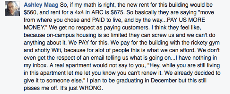For months, we were under the impression that we were eligible to renew our leases for the 2016-2017 school year. It wasn't until a few days before the housing application opened that some rumors began floating around that our beloved home-away-from-home may not be available to us for the upcoming year. This couldn't be true, right? Many students, including myself, attempted to contact the housing administration for answers, but we found the staff to be rudely unresponsive. I called multiple times and left several messages, but my concerns were ignored; my calls were never returned.
