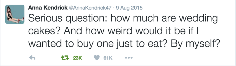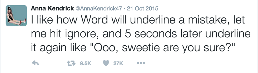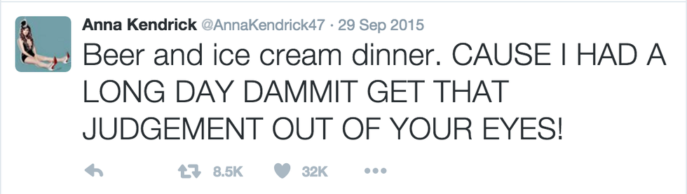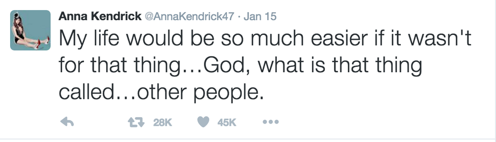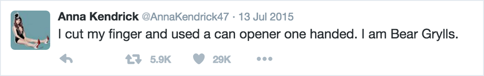 Although Anna Kendrick is a versatile actress, and can be featured in dramas, thrillers and musicals, her sense of humor is what makes us love her. She is witty, sarcastic and comical. Here are some of her funniest tweets that we can all relate to or agree with.