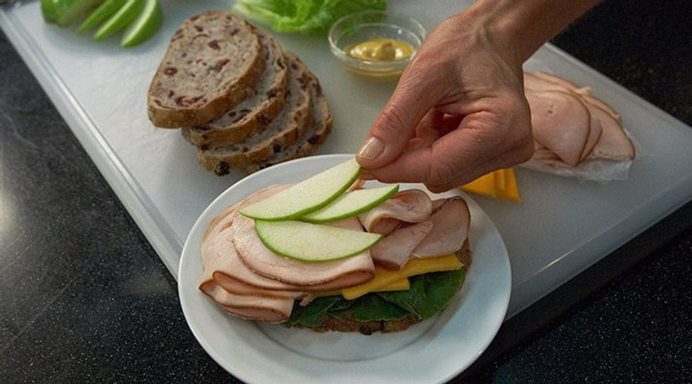 I like to think of this snack similar to Thanksgiving. Instead of cranberry with your turkey though, you have thin slices of apples wedged in with lettuce, cheese, and whatever else you prefer on your sandwich. This is a great way to spice up your traditional turkey sandwich and to try something new!