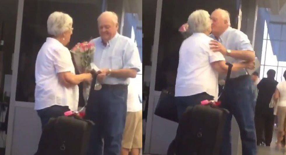 This happened. As captured in this video by Chris GQ Perry, an elderly man waited patiently with a bouquet of flowers as passengers exited a plane. The look on his face when his lady stepped off is enough to melt you into a puddle. Give love a chance.