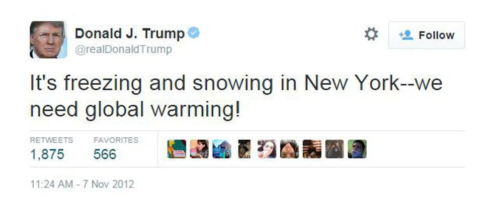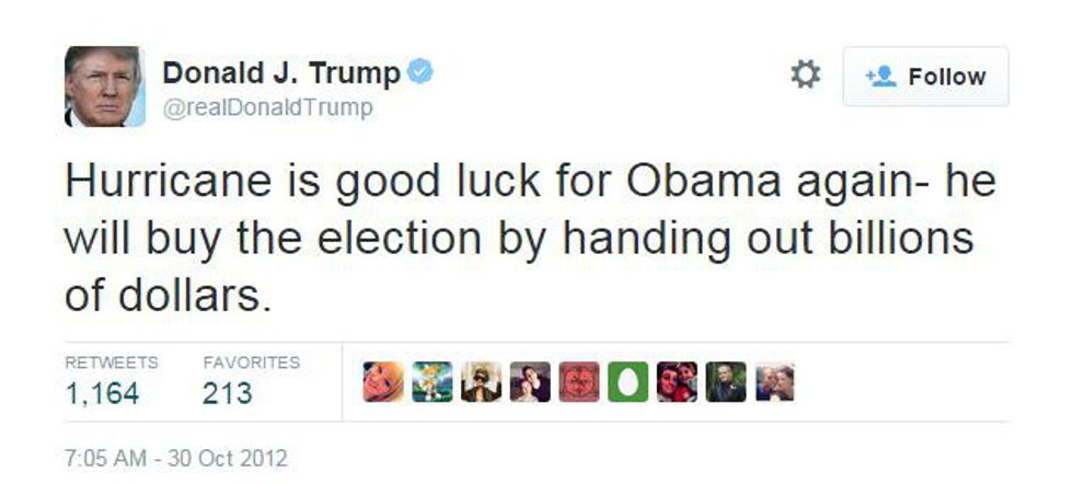 "Yes! Mother nature strikes again! Time to throw this cash," said Barack. Actually using FEMA after a natural disaster? How dare he? This gem of a tweet was posted shortly after Hurricane Sandy. The destructive storm caused an estimated $68 billion in damages from wind and flooding, but Trump probably didn't notice from his high-rise office above it all. You're right Trump, let's just wait it out instead of spending money to fix it.
