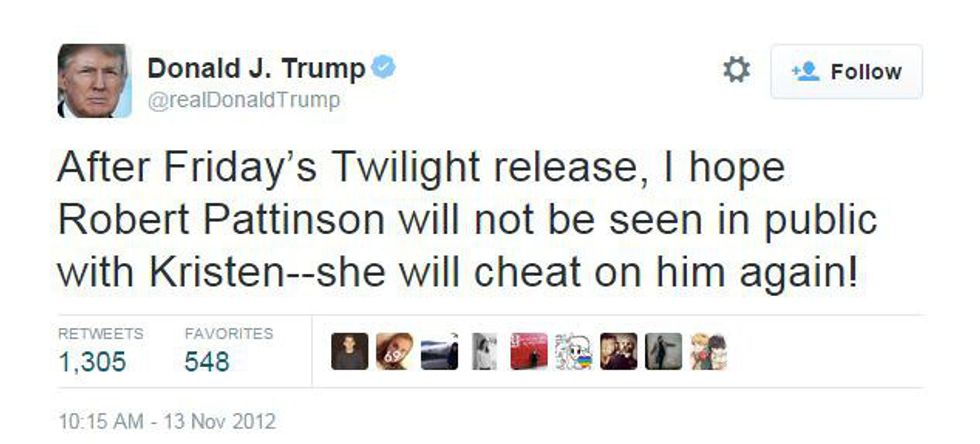 This isn't the only time Trump tweeted about the Twilight costars. When he isn't dishing out political banter, Trump likes to help the youth with their relationship problems. Especially publicity driven relationships like this one. Good looking out, Donald.