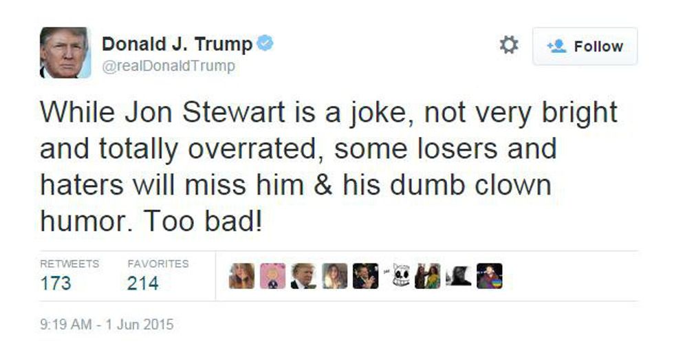 Maybe Jon Stewart should do what Trump did and use the popularity of his TV show to justify a presidential campaign. In all honesty, Stewart would probably make a better president than Trump ever could. Neither have any political experience whatsoever, but at least Stewart has a realistic grasp on the political climate in America. His TV show was political commentary. Trump's show can only be remembered as him saying, "You're fired!" to people he didn't employ.
