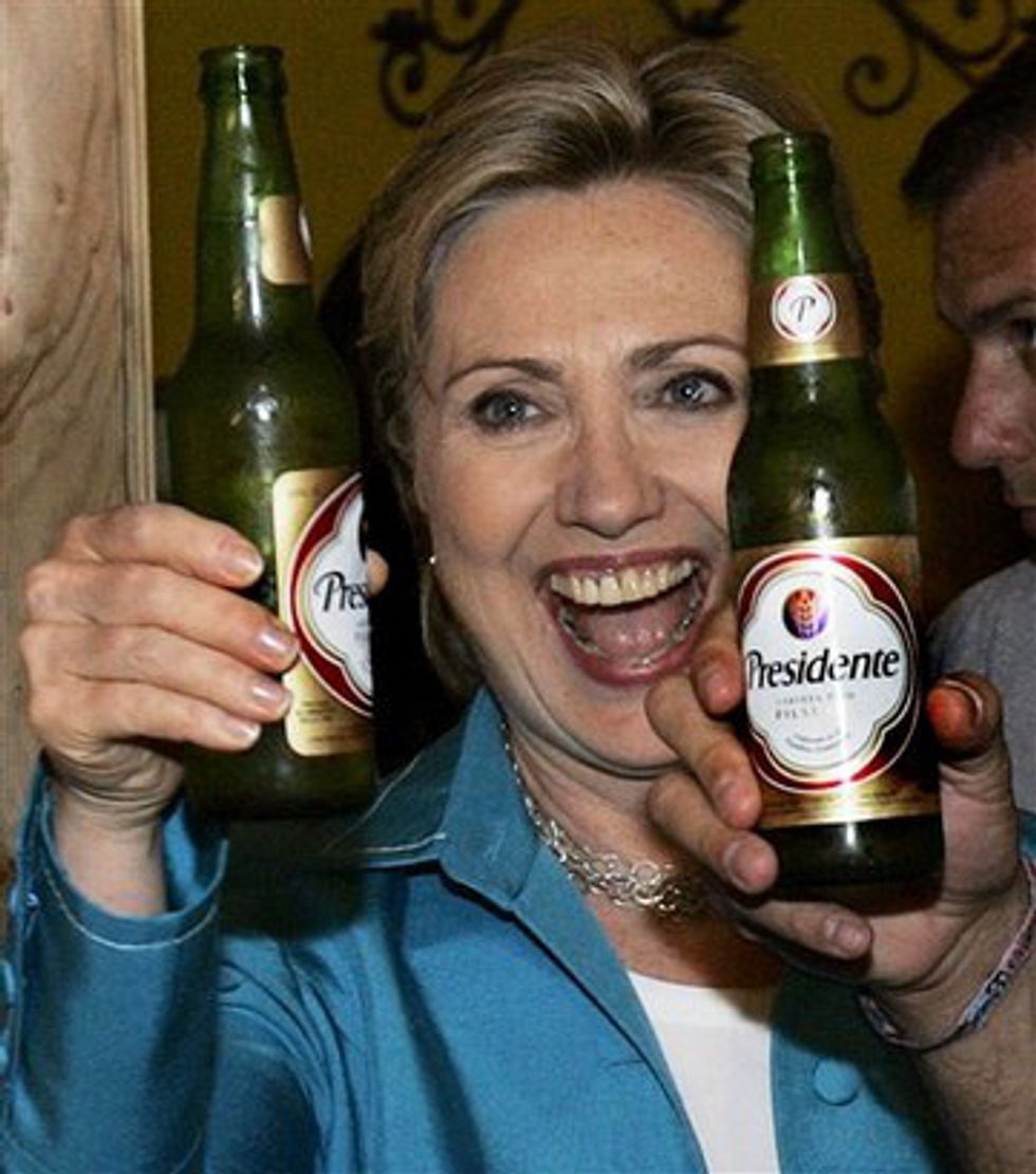 There are enough pictures of Hillary throwin’ ‘em back, but you mostly see her drinking Presidente. I guess that’s fitting because she wants to be the “presidente” and all.