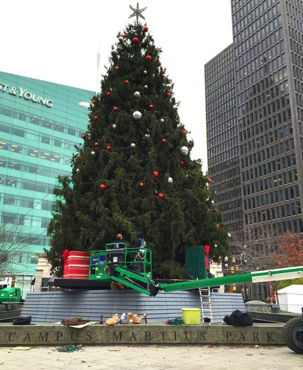 The grand tree, a Michigan-grown Norway Spruce, was provided by DTE Energy Foundation. The tree anxiously awaits being filled with light, as it has sat majestically atop the Woodward Fountain since Nov. 4. Standing over 60 feet tall, and weighing over 10,000 pounds, this tree will undoubtedly be the largest in Detroit. And with over 19,000 energy-efficient, multi-colored LED lights and ornaments, it may even be the most beautiful.