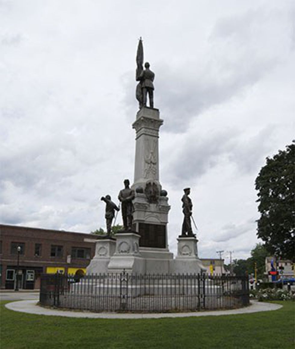 Not too far from Worcester stands a 40 foot memorial outside the Webster town hall. The statue has four bronze soldiers on at the base, signifying the four branches of the military: artillery, navy, cavalry and infantry. Erected at on top of the pedestal stands a bronze flag bearer. On each side of the monument are the names of the Webster soldiers who served in some way during the Civil War. The monument was created by Finn Haakon Frolich and J.N. White & Sons. Costing $16,000 dollars at the time, the monument was dedicated on July 7th, 1907.