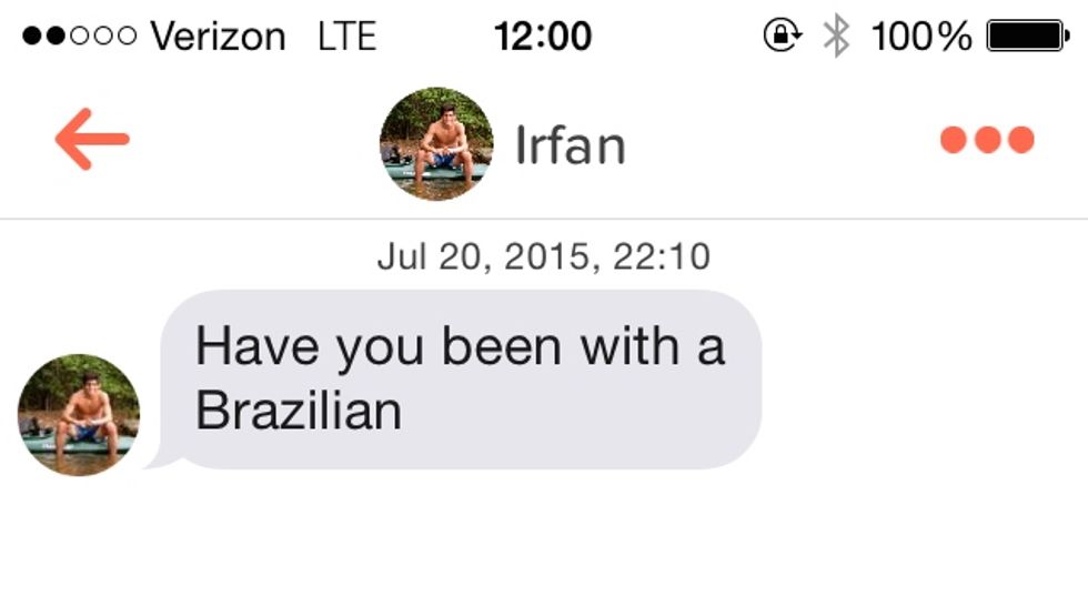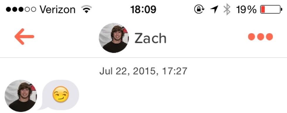 Before I share the following delightful interactions, I want to explain how Tinder really works for those of you who have never used it or for those of you who know what it is but don't know how to use it. Basically, you have a profile which includes five pictures, a 500-character bio (mine was, "My dog is probably cuter than yours."), and that's it. Then, you set your qualifications for the kinds of people you want to see: all male, male and female, or all female (I selected all male), an age requirement (I set mine at 18-22), and a radius around your location (I picked 30 miles) so you're only seeing people who are relatively nearby. It's pretty user-friendly; it took me about three minutes to set mine up. Anyway, once you're all good to go, the app is pretty simple—someone's profile pops up, and you can either swipe right or swipe left. Swiping left means that you're not interested in that person, so their profile disappears. Swiping right, on the other hand, means that you like that person and you're interested in getting to know them better. However, swiping right doesn't guarantee that you get access to that person—they have to swipe right on you as well before you can get the opportunity to communicate. When you get a match, their name will pop up and you will have the chance to message them and they have the ability to do the same to you. Pretty simple, really. In all honesty, if the site weren't so sketchy, it would be a pretty cool idea. What's not to like about getting to know people in your area? But anyway, regardless of the sketch factor, I tried it for a week, and I had some interesting interactions.