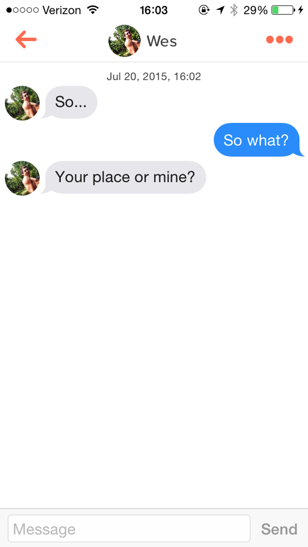 Just as you would expect, I crossed paths with some guys on Tinder who weren't exactly looking for conversation, if you know what I mean. I'm sure they're lovely people, but a lot of the opening lines were straight up awful, like Wes here: