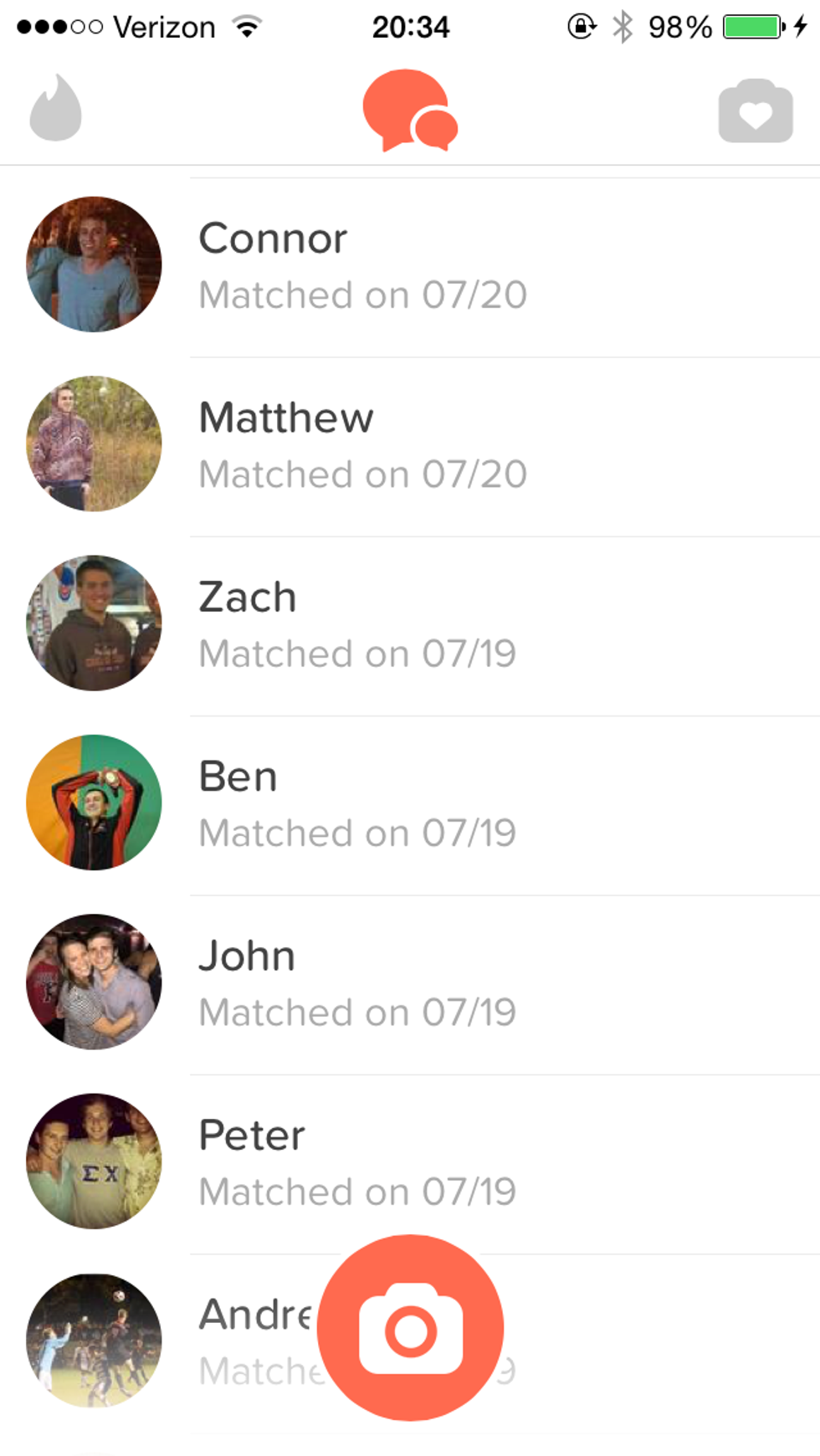 I suppose this must've been a naive belief of mine, but I just assumed that all of the guys I matched with would message me. Not because I think I'm just irresistible, but because I thought that that was the whole point of the matching system. In reality, only about half of my matches ever ended up talking to me, if not fewer than that. I was pretty disappointed, honestly, because some of the guys I matched up with seemed like they would be funny. Again, I'm basing this assumption purely off of five pictures and a two-sentence bio, but still—I was looking forward to some of these conversations that never happened. Bummer.