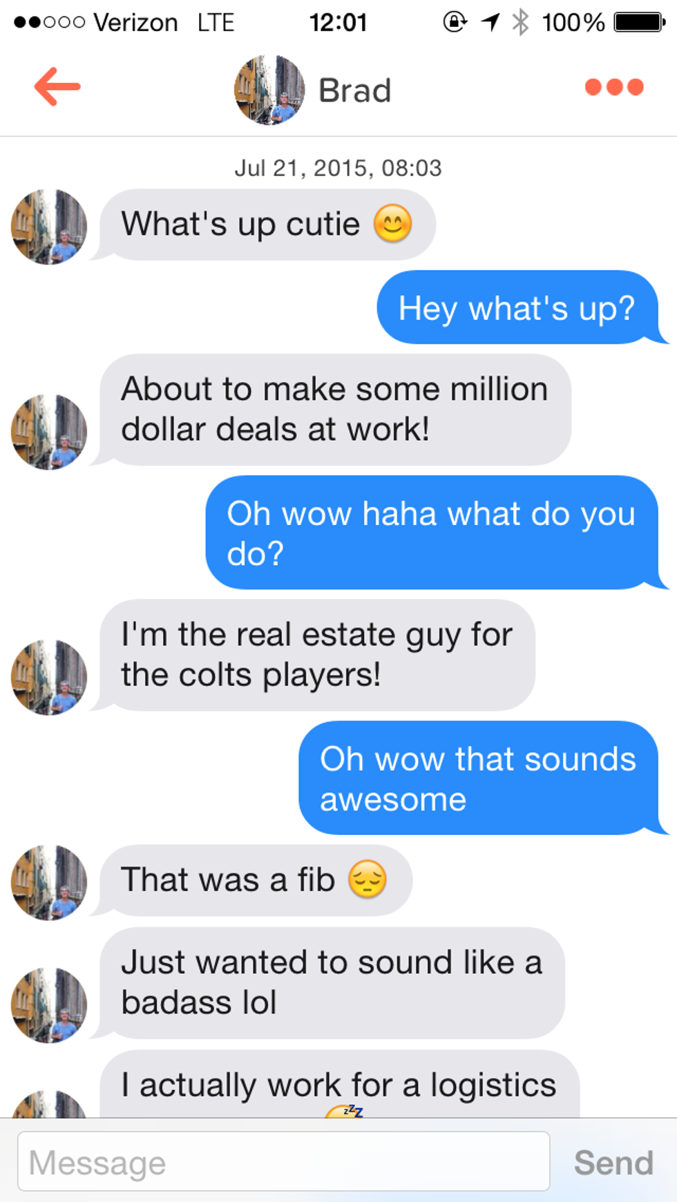 He lied about his job to sound cooler, but his made-up job was a real estate agent—way to dream big, bro.