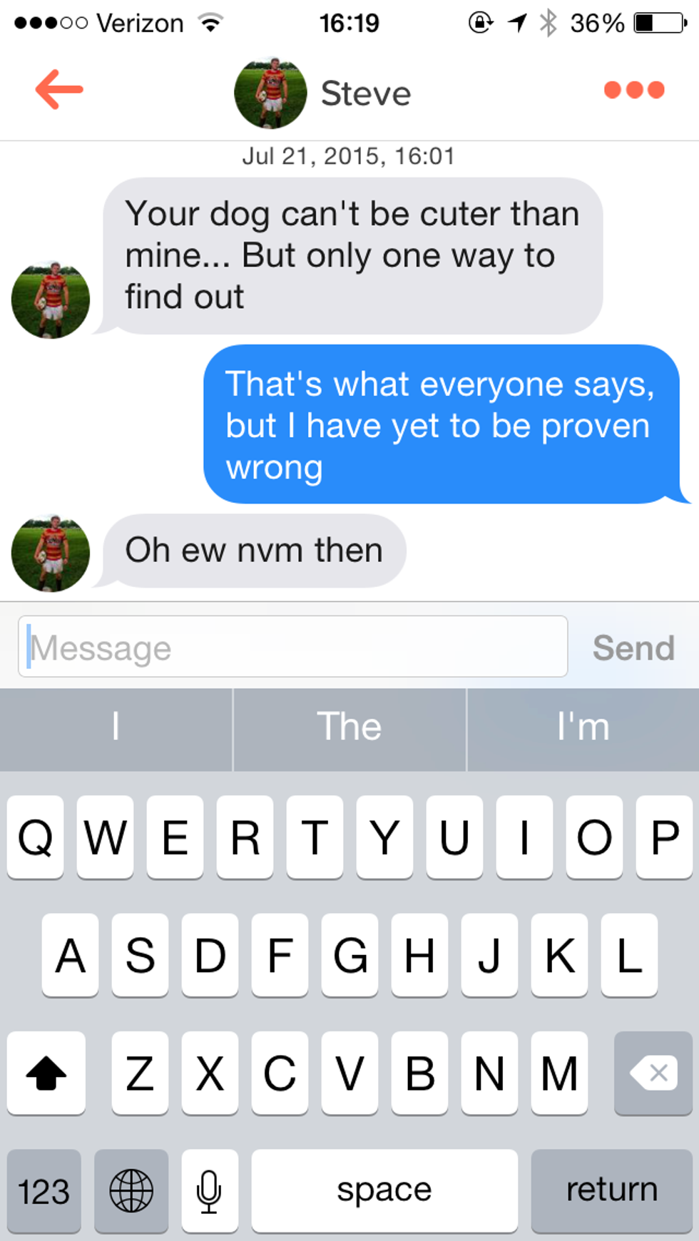 This really surprised me. I was expecting the vibe to be that whole "girls that make the first move are cool" thing, but I was completely wrong. I tried to start conversations with the guys that had the funny bios, like the guy who said "working on my dad bod" or another guy who said "I'm not as ugly as I look" or another one who said, "Currently attending ______ University but I'm transferring to Hogwarts in the spring." When I didn't get a message from any of them first, I figured, "hey, I'm gonna go for it, they seem cool." I was sincerely disappointed. Most of them didn't respond, and the ones who did just laughed at my snide comment and then the conversation sort of petered out from there. I don't know why these guys didn't seem interested in continuing the conversation, because they obviously swiped right. I thought that I could spark up some interesting conversations by asking some weird questions like, "Would you rather make a foghorn noise every time you tried to speak or cluck like a chicken every time you blinked?" Shockingly, I didn't get any responses to this question. I guess that is not a question to use in an introduction. Duly noted.