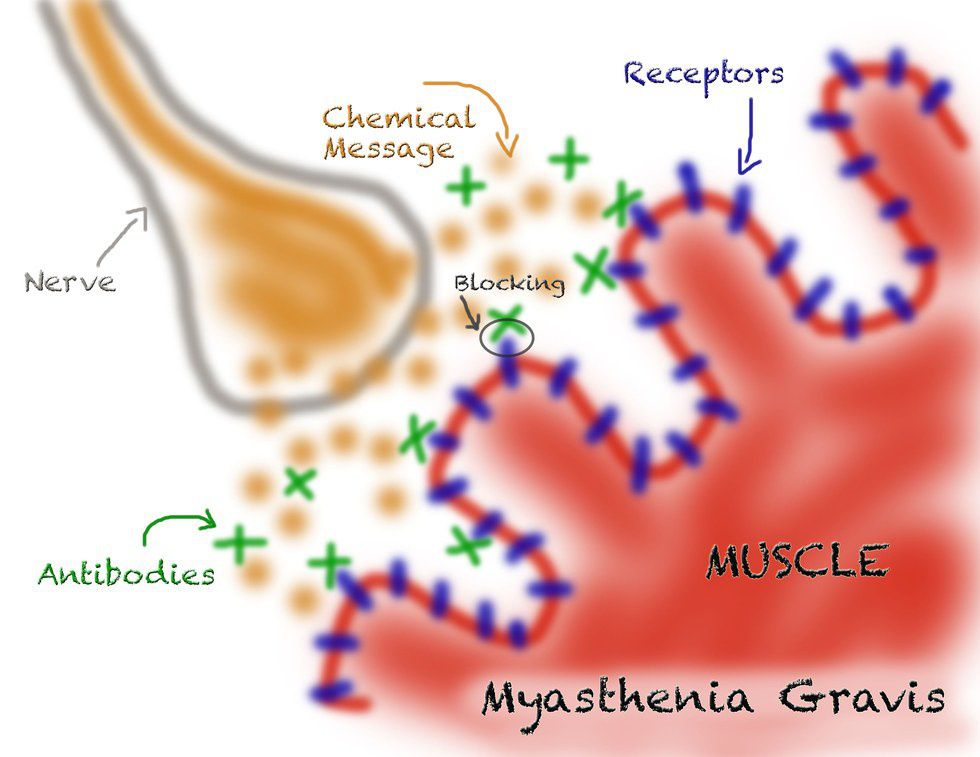 The physical explanation of how Myasthenia Gravis challenges the body includes the process of communication between the brain and muscle. Whenever you want to smile at someone, your brain thinks, “I want to make my face muscles smile,” and that message travels through a nerve fiber to the spot where the smile muscles are.The end of that nerve doesn’t touch the muscle fibers, and normally when the impulse gets to the end of the nerve, it releases something called acetylcholine which works like passing a note from the end of the nerve to the muscle fiber. This message isn’t written or spoken, of course, but is a chemical that has been aimed toward the muscle fiber. The muscle has many little message-takers, or receptors, that read the chemical message and, once enough of the receptors read what the impulse wants, the muscle moves to make a smile.