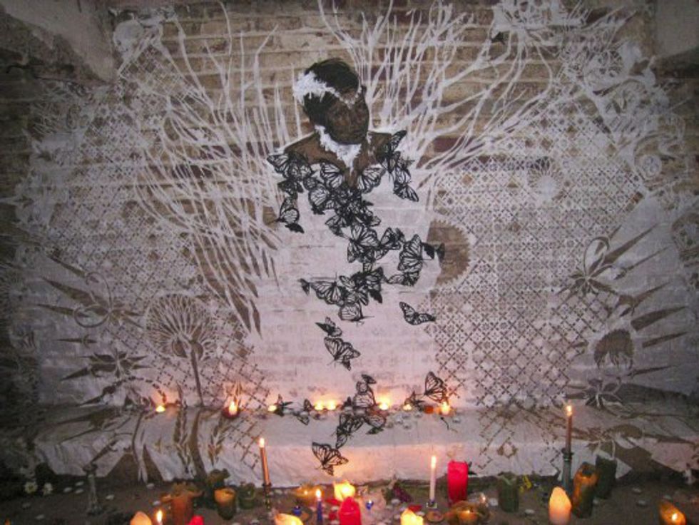 Swoon creates intricate pieces made of paper and puts them in public spaces, as well as installations and floating pieces. She uses paper because it is a fragile medium which eventually peels away and disintegrates – representing the transience of the focus on tragedy in our culture. Her work often focuses on dead or disappeared people.