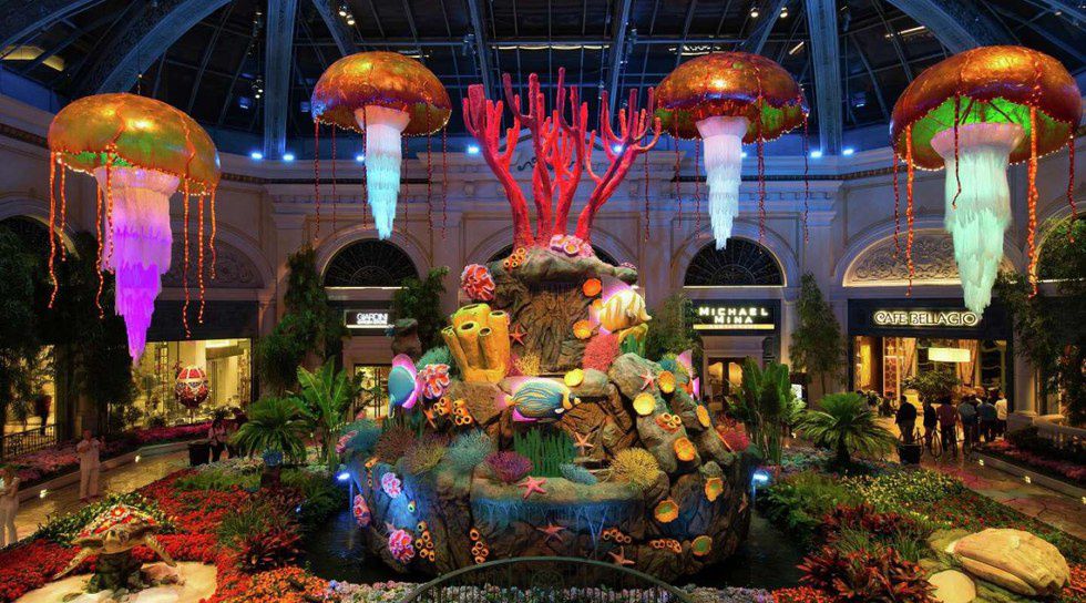 The Bellagio states, "Each season, the enormously talented horticulturalists and designers who make up the Bellagio Conservatory team transform this 14,000-square-foot floral playground into a showcase of the distinctive sights and colors of spring, summer, fall and winter—along with a special display for Chinese New Year." The current theme for the garden is a breathtaking aquatic scene.