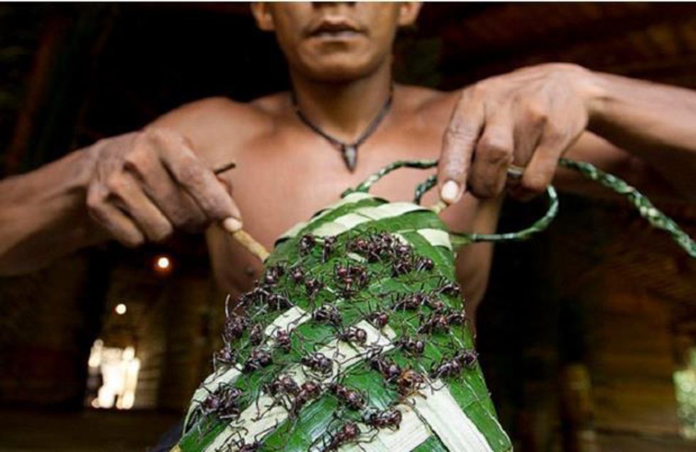 The Sateré-Mawé, a native tribe in Brazil, hold a tradition for a young boy's 13th birthday called the Bullet Ant Initiation. The tribe searches the jungle floor for bullet ants, a particularly aggressive breed of ant, and collects them. The ants are woven into large handmade gloves, stinger end up, and the lucky boys must wear the gloves for up to ten minutes. By not crying out in pain, they demonstrate they are now men.