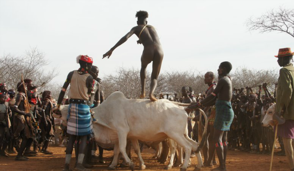 In Ethiopia, coming of age is can also be viewed as a bachelor party. In this fun ceremony, the grooms-to-be must jump naked over four adult bulls to symbolize their transition into manhood.