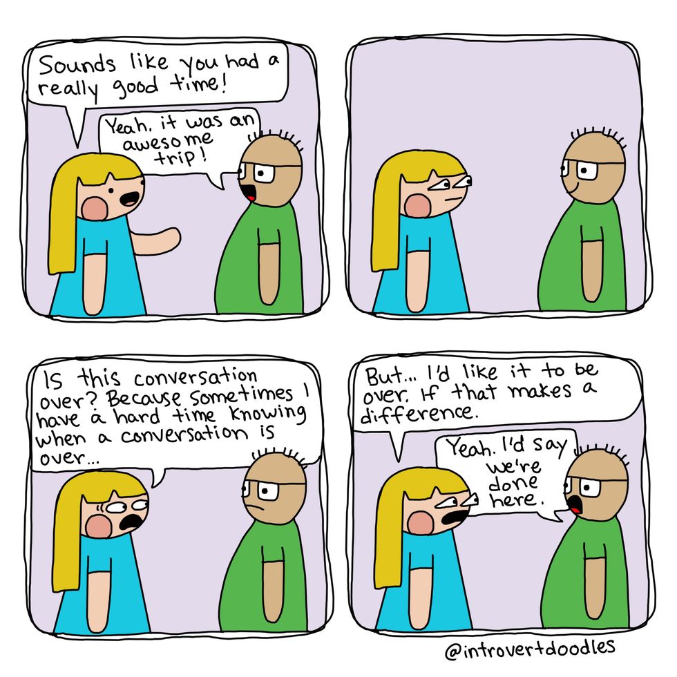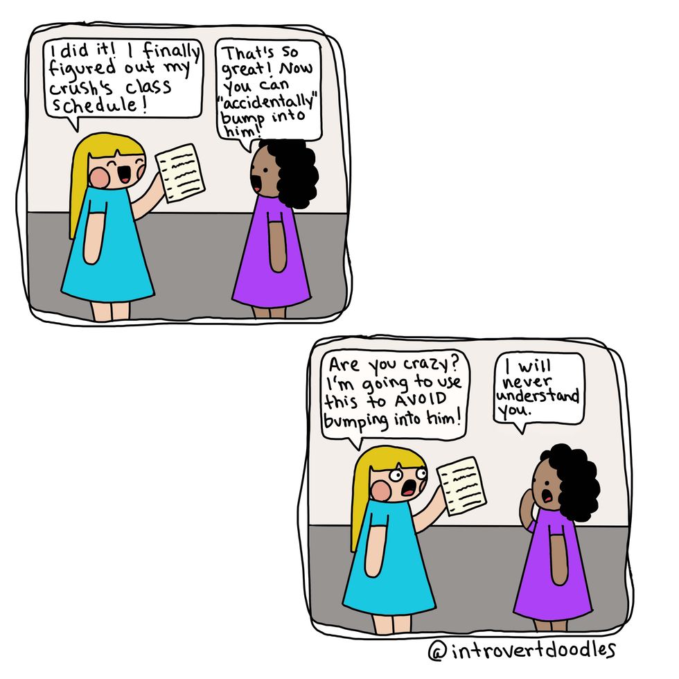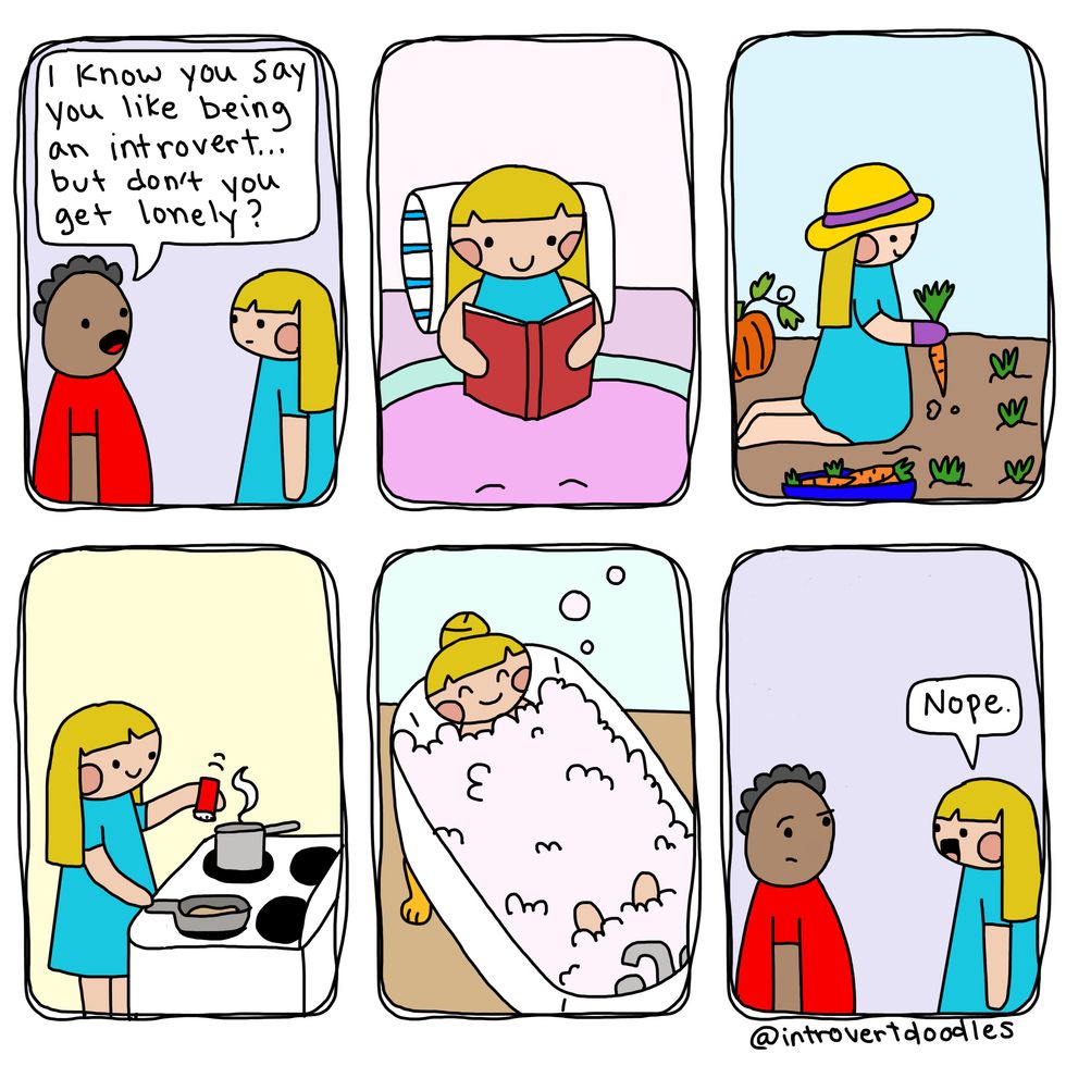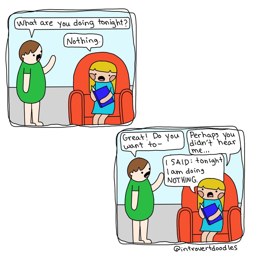 Being an introvert doesn't mean I don't like people. It can actually become exhausting for me to spend time around large groups, and I can "recharge" by spending time alone. Just because I'd choose a quiet evening at home rather than a social gathering shouldn't define me as unsocial. A while back, I came across these amazing IntrovertDoodles by the talented Marzi. She is an introvert living in an extroverted world, like many of us, and has chosen to use her creativity to create comics for other introverts out there! Her doodles perfectly describe the struggles introverts go through, and hopefully they will shine a light on why being different isn't a bad thing.