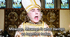 "Mawage. Mawage is wot bwings us togeder tooday. Mawage, that bwessed awangment, that dweam wifin a dweam... And wuv, tru wuv, will fowow you foweva...So tweasure your wuv." Wise words fwom The Impressive Clergyman. Treasure your loved ones and never take them for granted. They are truly a tweasure.
