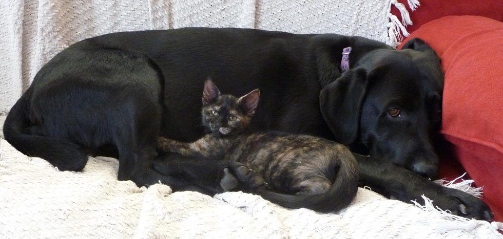 Just look at this lab with a cat. Our first lab, Lady, had a special bond with one of our cats, Lucky. They would often be seen lying together under the sun, by the door, or in Lady’s dog bed. Lady then taught our next labs, sisters Daphne and Duchess, not to chase cats, but rather to be friendly toward them.