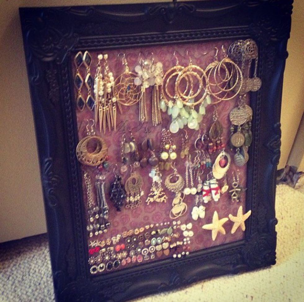 Here's an earring holder I made with a cheap picture frame, cardboard, fabric and some netting from Micheals (I put my own spin on the instructions!).