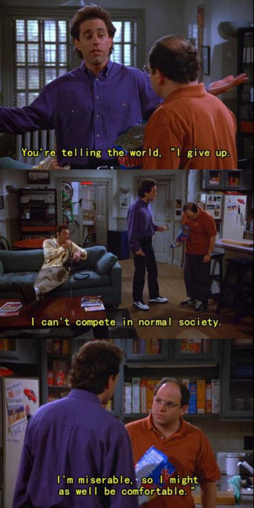 “You know the message you're sending out to the world with these sweatpants? You're telling the world, 'I give up. I can't compete in normal society. I'm miserable, so I might as well be comfortable.'”