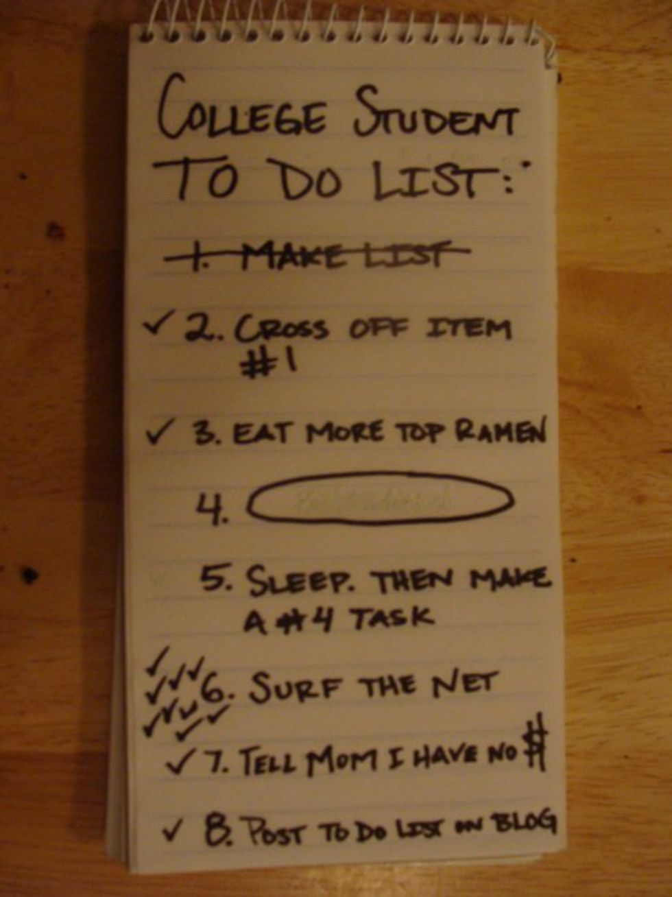 Successful people have a habit of making a to do list for the day. Something I have found helpful is to make a list for studying and another list for errands, such as laundry. Include in your list what subjects you will be studying, how many pages of your paper you will write, and how much homework you want to get done.
