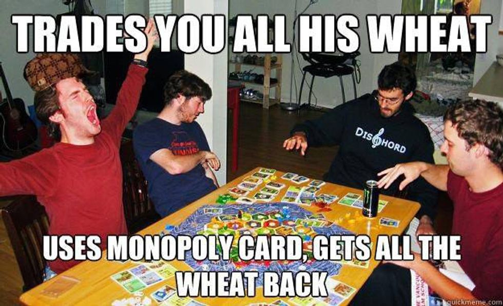 Welcome to your handbook that will define some of the prospects that you call "friends" who play this savage game. Like I always say, "settlers of catan is a savage game for savage people." It will always be the go-to board game with all of my friends and hopefully yours too. At times it might strain your friendship because well love is a battlefield, but here you clearly peek into the real hearts and souls of your companions. Here are a list of the people you might find surrounding the table at game night when playing Settlers of Catan.