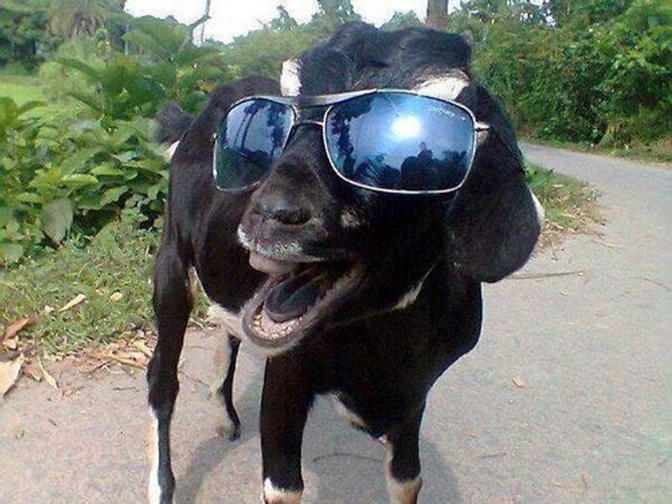 You think you're cool? You think you've got a lot of friends? You think an animal couldn't possibly have you beat? Wrong. Look at this goat. That smirk. That posture. That well-groomed hair. This goat is more confident than any human being could ever hope to be. Do you think this goat has ever wondered if someone really liked him? No! Because he knows everyone likes him. I haven't even mentioned his shades yet. Look at how he pulls them off. I've seen models who can't pull off shades like this goat. You see this guy walk into a room, you know things are about to get interesting.