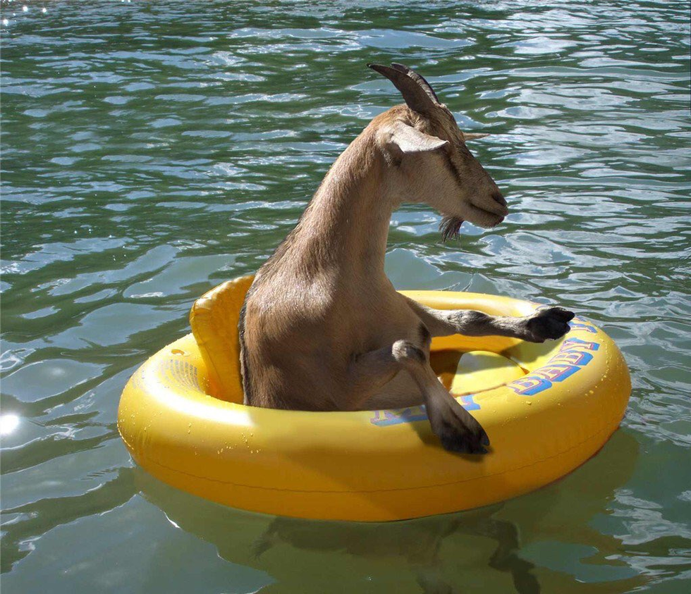 Humans love water. Goats love water. There, now we have a common interest. Also, look at how safe this goat is being. He brought a little floaty to make sure he'd be safe. Dogs just jump into the water willy-nilly. Not goats.
