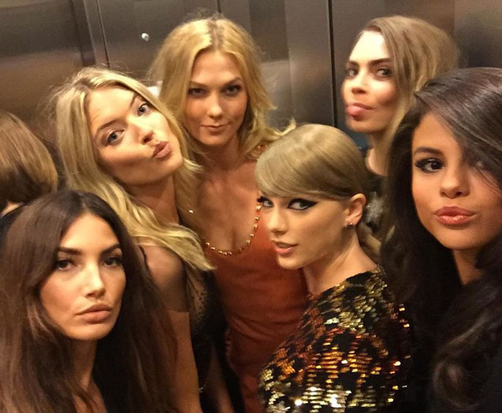 Just casually hanging out in elevators with Selena Gomez and Cara Delevinge.