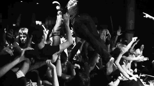 Back to the concert scene. So. You're in a room with hundreds of people whose names you don't know, and whose faces you can only half-make out in the dark. In the back of the room are the people standing around, talking, holding drinks, seemingly aloof to the eardrum-blasting live music happening in front of them. In the middle of the room is the ring of people I explained towards the beginning of the article. The ring of people are tightly compacted, usually head banging, but not moving that much. Inside the ring of people is the mosh pit, which we've already visited (flailing bodies). Finally, in the front of the room, closest to the stage, is the push pit. This is where I usually reside because a) it's a lot less scary than moshing, and b) because it's the area closest to the performers, so there's a lot of energy here. As its name suggests, the push pit is full of pushing. Friendly, yet sometimes extremely intense, pushing. Everyone is being pushed and everyone is pushing, by throwing their bodies from side to side. Some people are very serious push-pitters, some people are busy yelling all of the words to the song being played, and some (like me) are laughing for most of their time in the push pit (because it's like, really fun). No one talks about this stuff. It's just a thing, and people have a mutual understanding of how it works and what the limits are. And we're all either standing, flailing, pushing, head banging, or soaring above the crowd--all experiencing this amazing live performance. People are sweating. People are yelling. People are exploding with emotion. It is the loudest, yet most preciously intimate experience in the world.