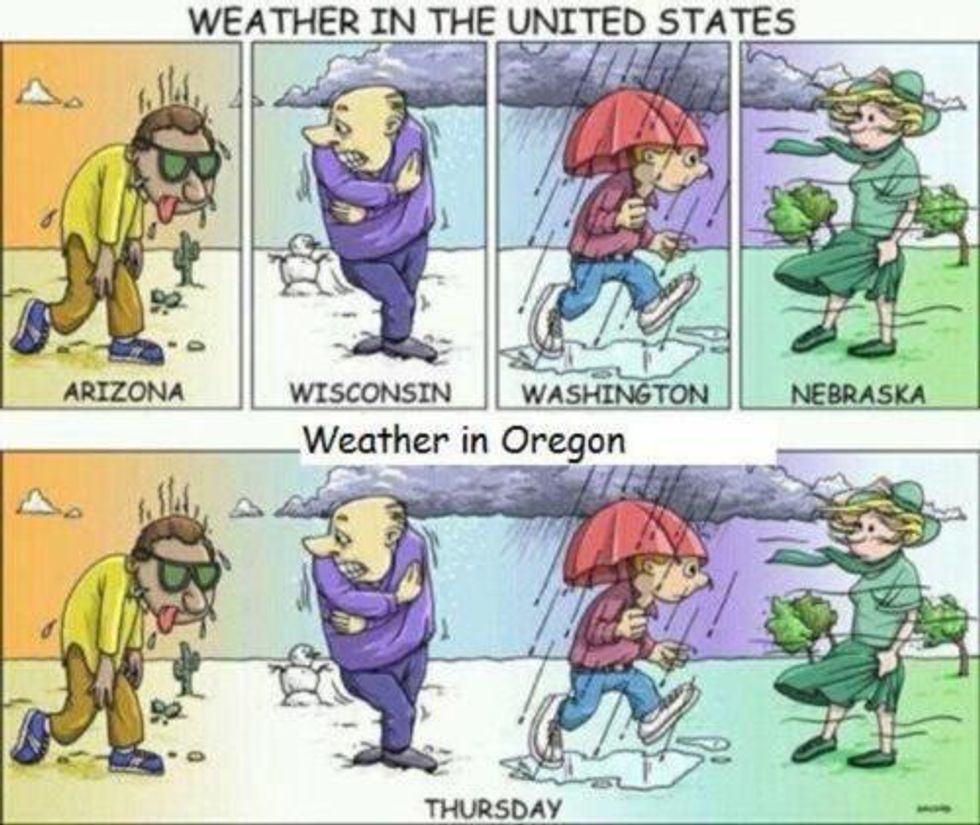 These days up in Salem, Oregon there has been a lot of rain. Not just a sprinkle or a drizzle. It is constantly raining cats and dogs. The weather is so temperamental; it's often very cold in the morning, then the sun peeps behind the clouds for just a moment, and right when you believe it's actually going to be sunny, it starts raining again. Coming from bright and warm Northern California, even after three years at Willamette,I am still so unused to the sheer amount of rain. I just felt, as a person that really dislikes rain, the need to write an article about 11 thoughts I have when I walk out the door and see puddles on the ground.