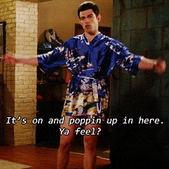 6. That Friday night that Schmidt was getting ready to go out but was first lounging in his Kimono or as he likes to call it his 'mono.