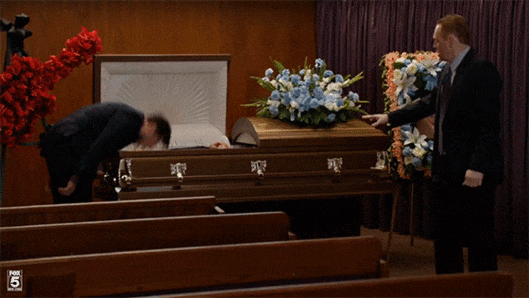 7. Schmidt has a fear of dead people but overcomes that fear at Nick's father's funeral in the strangest way.