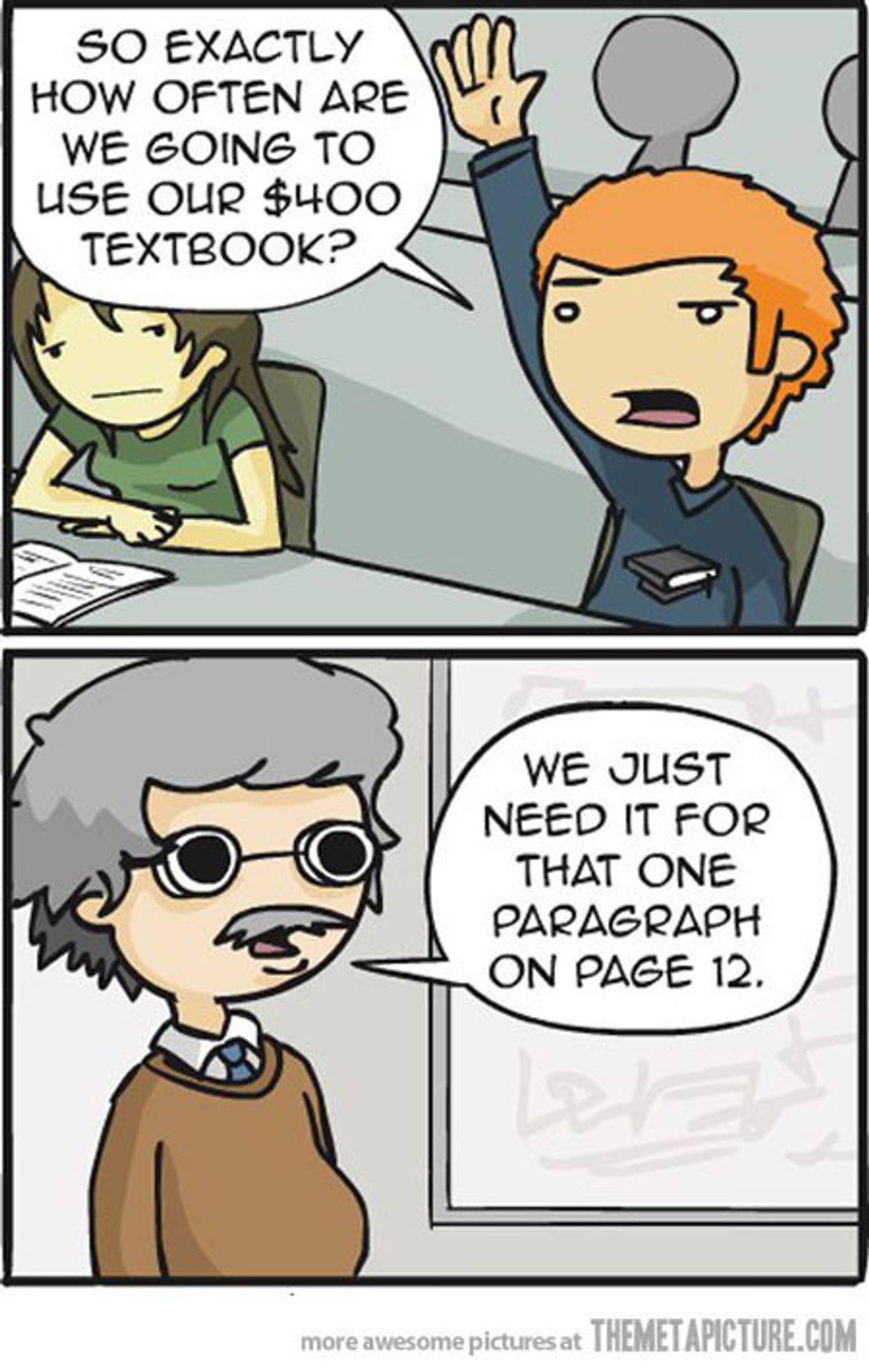 You spend hundreds of dollars for textbooks, and most of them remain in the trunk of your car; at least mine are.