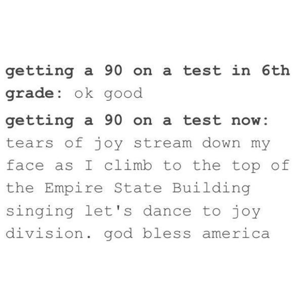 Your expectations for grades slowly turn into the mantra "C's make degrees."