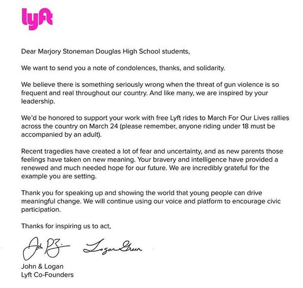 Lyft just announced that they will be offering free rides to and from rallies and marches. Walmart and Dick's will no longer be selling guns to patrons under the age of 21, and Dick's will stop selling assault type weapons. Countless celebrities have donated huge sums to the march, including John Legend, Chrissy Teigen, and George Clooney.
