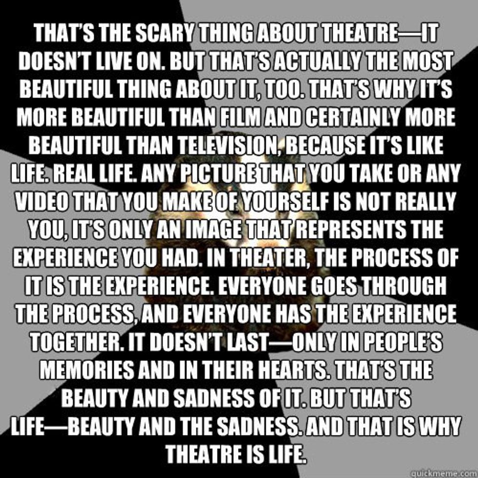 Working in theatre has its ups and downs. Long nights of rehearsals, load in and strikes for days, and there are some days that you never see the sun, but it is one of the most rewarding jobs out there, especially for anyone who loves theatre. Whether you're an actor that lives for the applause or a techie that lives for creation and ideas, theatre is something we can all call home because it's our calling. It brings along many lovely things and one of those things are funny memes about inside jokes throughout the theatre world.