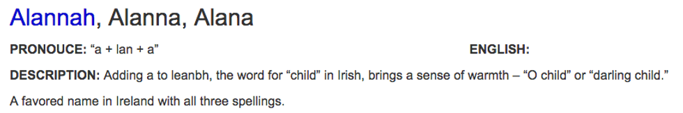 Alana, Alanna, or Alannah is a term of endearment that means "darling girl" or "joy." My Nana used to call my sister "Tara Alana," which is where my name comes from.
