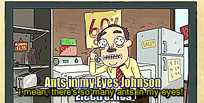Ants In My Eyes Johnson is an icon. He is only seen for a short time during his commercial on inter-dimensional cable, but his impression is long lasting. He can’t see AND he has a rare disease in which he can’t feel anything. He doesn't even know if he’s standing or sitting.