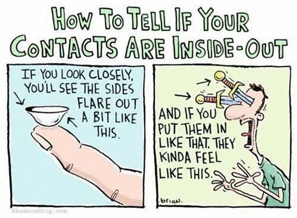 Before I got contacts I never knew pain. Putting in a contact inside out is one of the most painful things along with getting an eyelash stuck in there or eve having your contact rip while in your eye.
