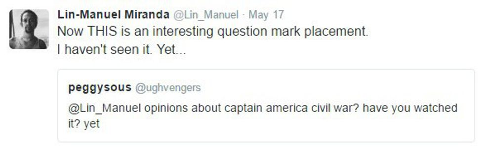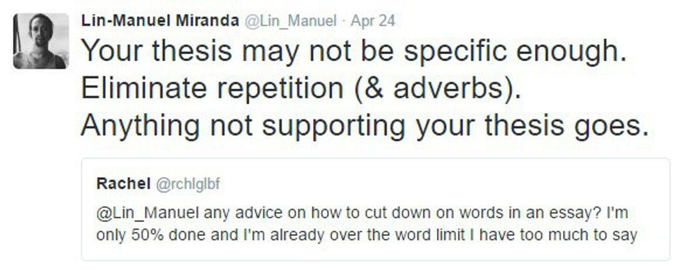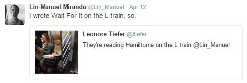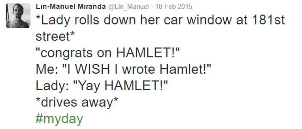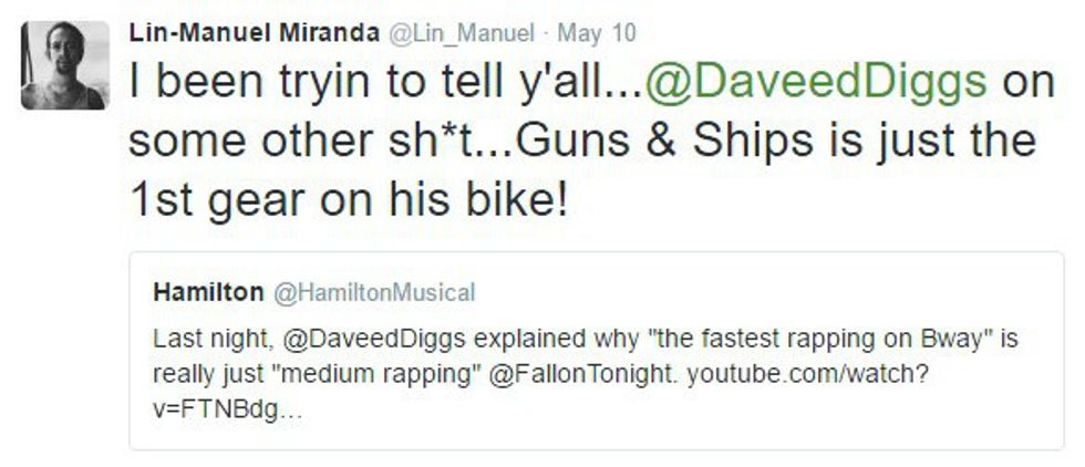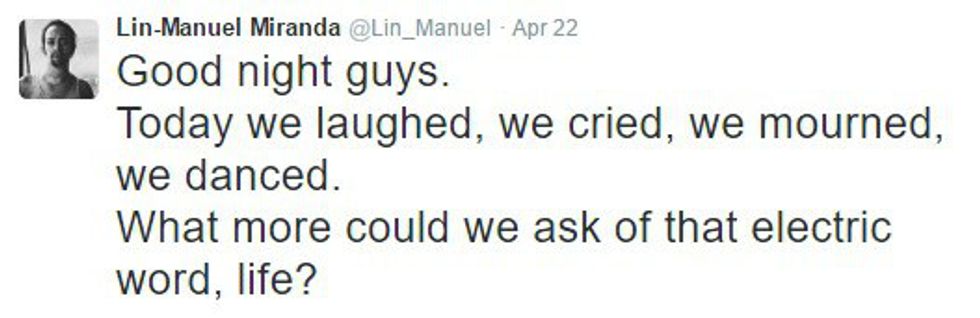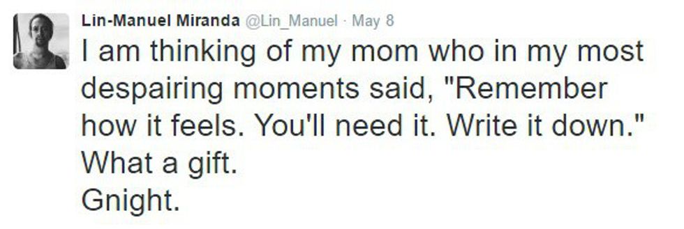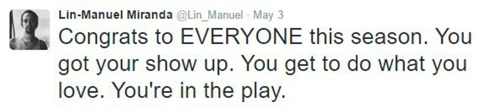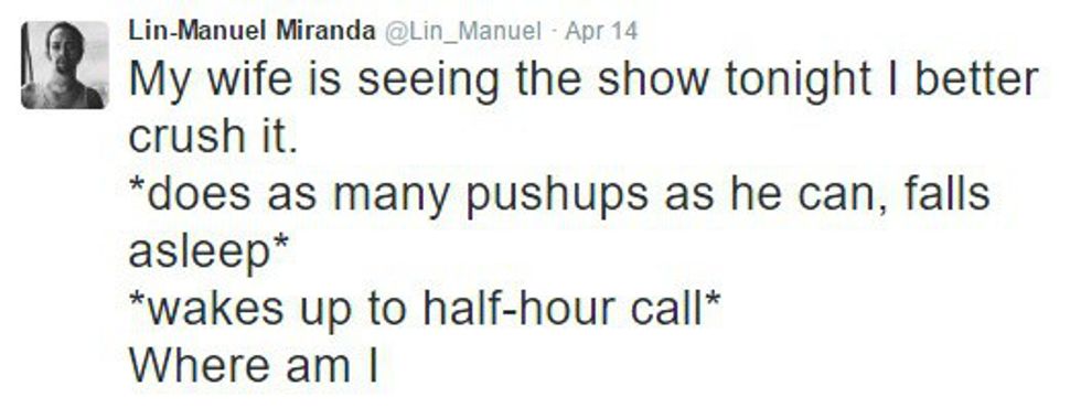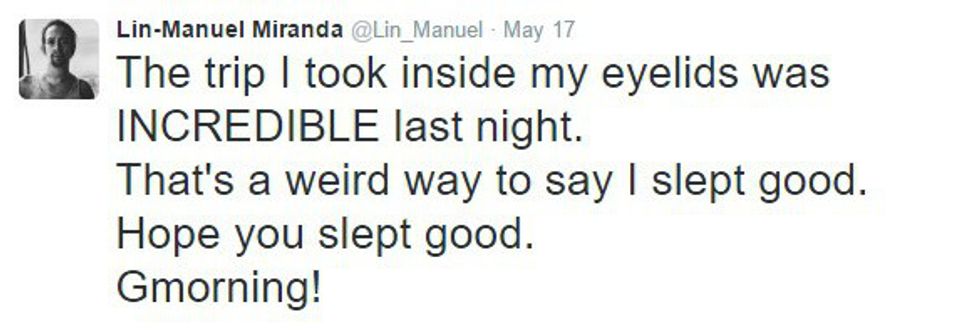 Lin-Manuel Miranda is the brain behind "Hamilton," the Broadway musical that's kind of taking over the world. "Hamilton" is a show about the founding of America, especially the significant role Alexander Hamilton played in building our nation. Yes, Alexander Hamilton, that guy they wanted to take off of the 10 dollar bill. But I'm not here to talk about that show everyone else is talking about. I'm here to talk about the genius who wrote it. Miranda is very active on Twitter, despite his busy schedule. Seriously, though, I don't know how this guy even finds time to sleep. He's sending out 140-character-long messages at all hours of the day, with many of them in reply to fans. From the sarcastic to the thankful to the inspiring, there's one common thread weaving through each of Miranda's tweets: he simply wants to let his fans know that he is always thinking about them and that he will never stop thanking them.